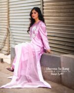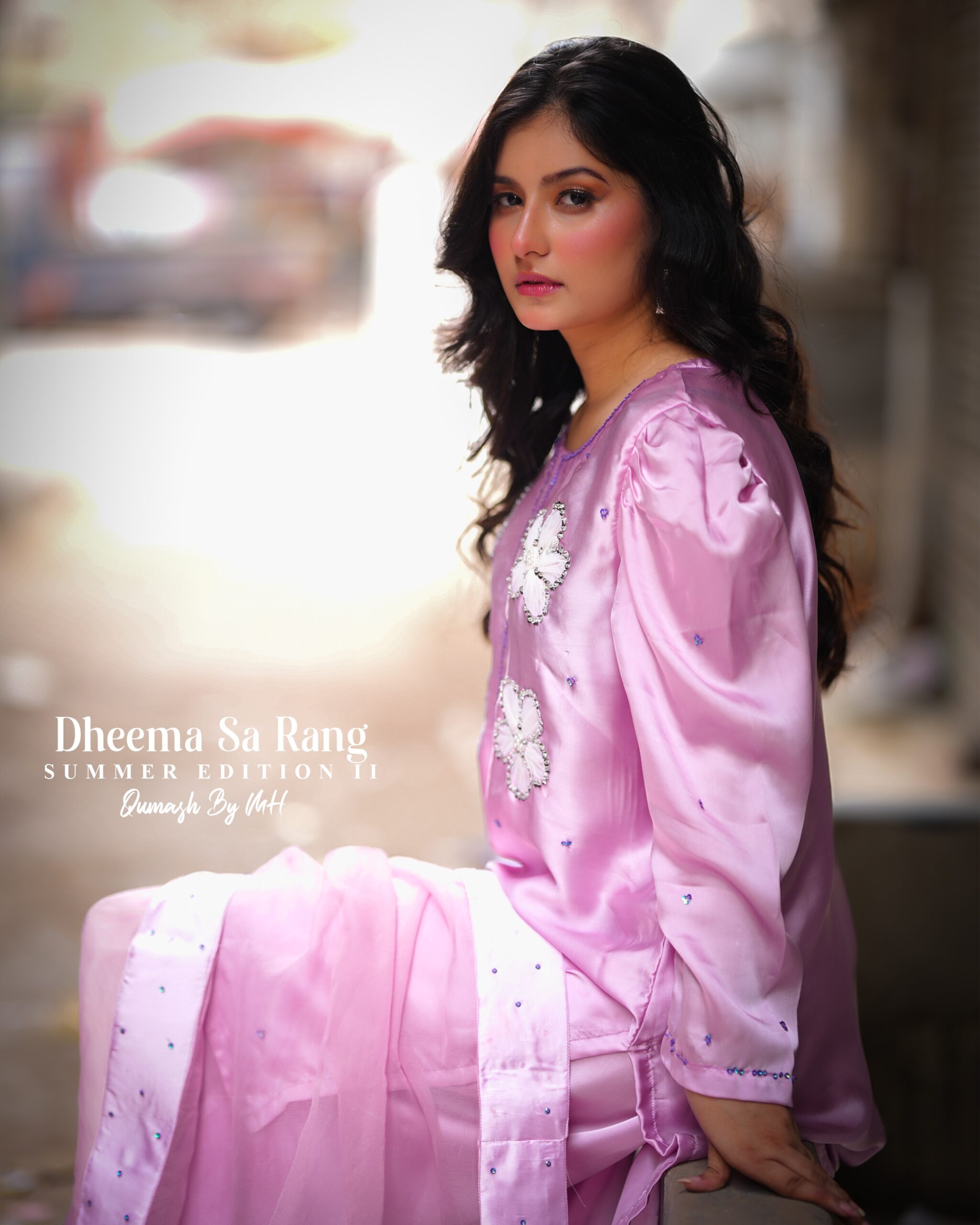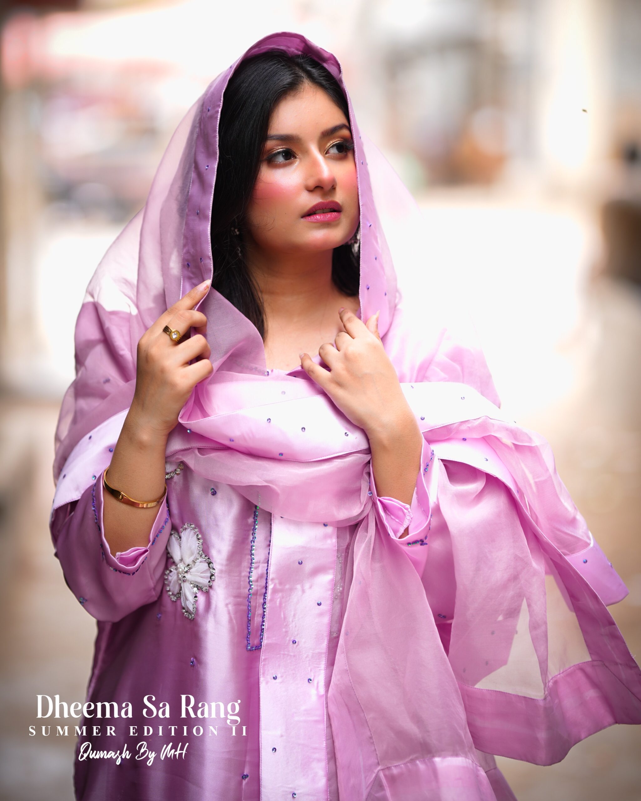 Elegance meets serenity in Gulbahar Glow — a radiant creation from our Dheema Sa Rang chapter. This pastel silk ensemble brings out effortless grace with its delicate handwork and soft shimmer. The floral embellishments, crafted with pearls and crystal detailing, add a dreamy glow to your look, making it perfect for summer soirées, Eid festivities, or intimate celebrations.