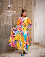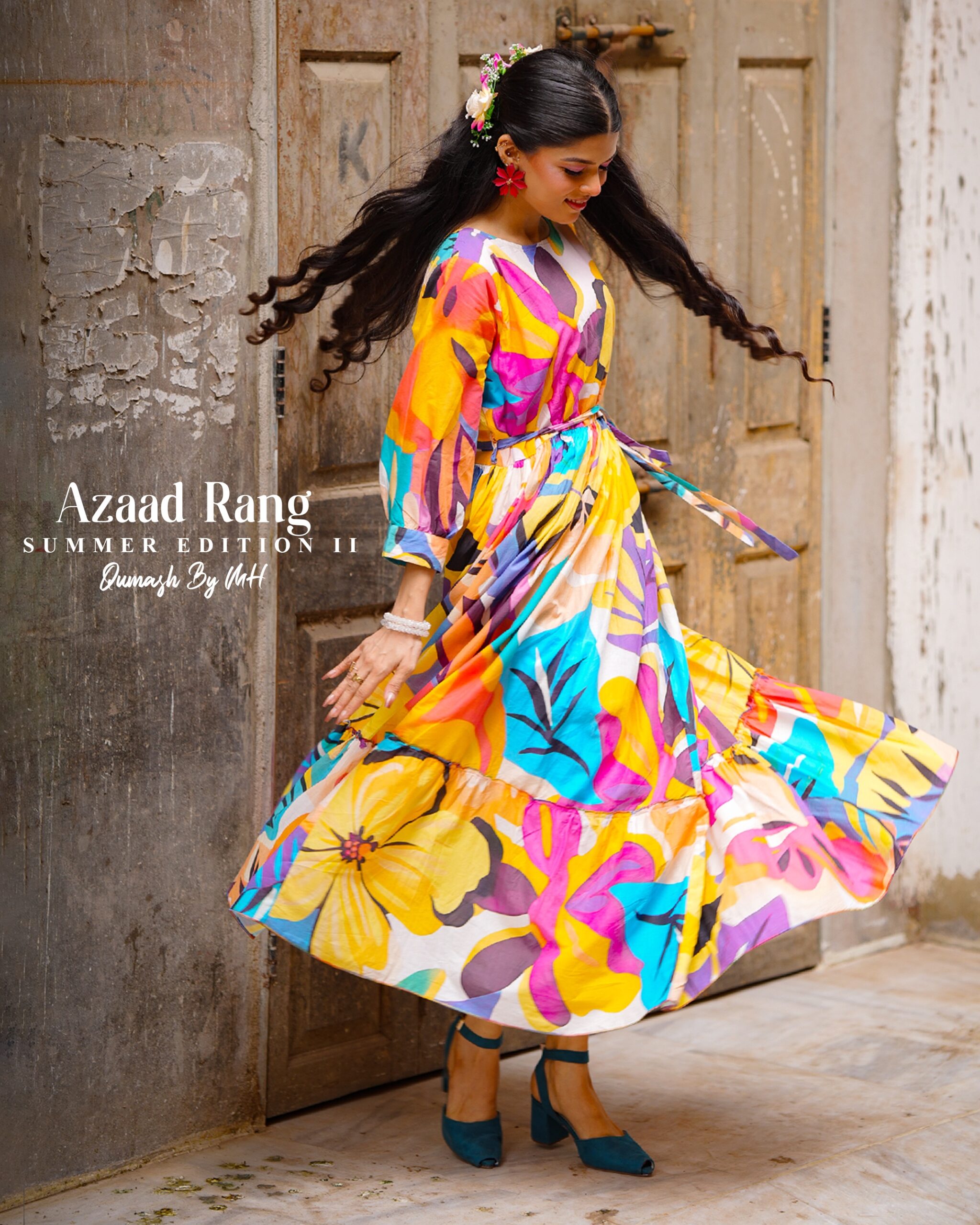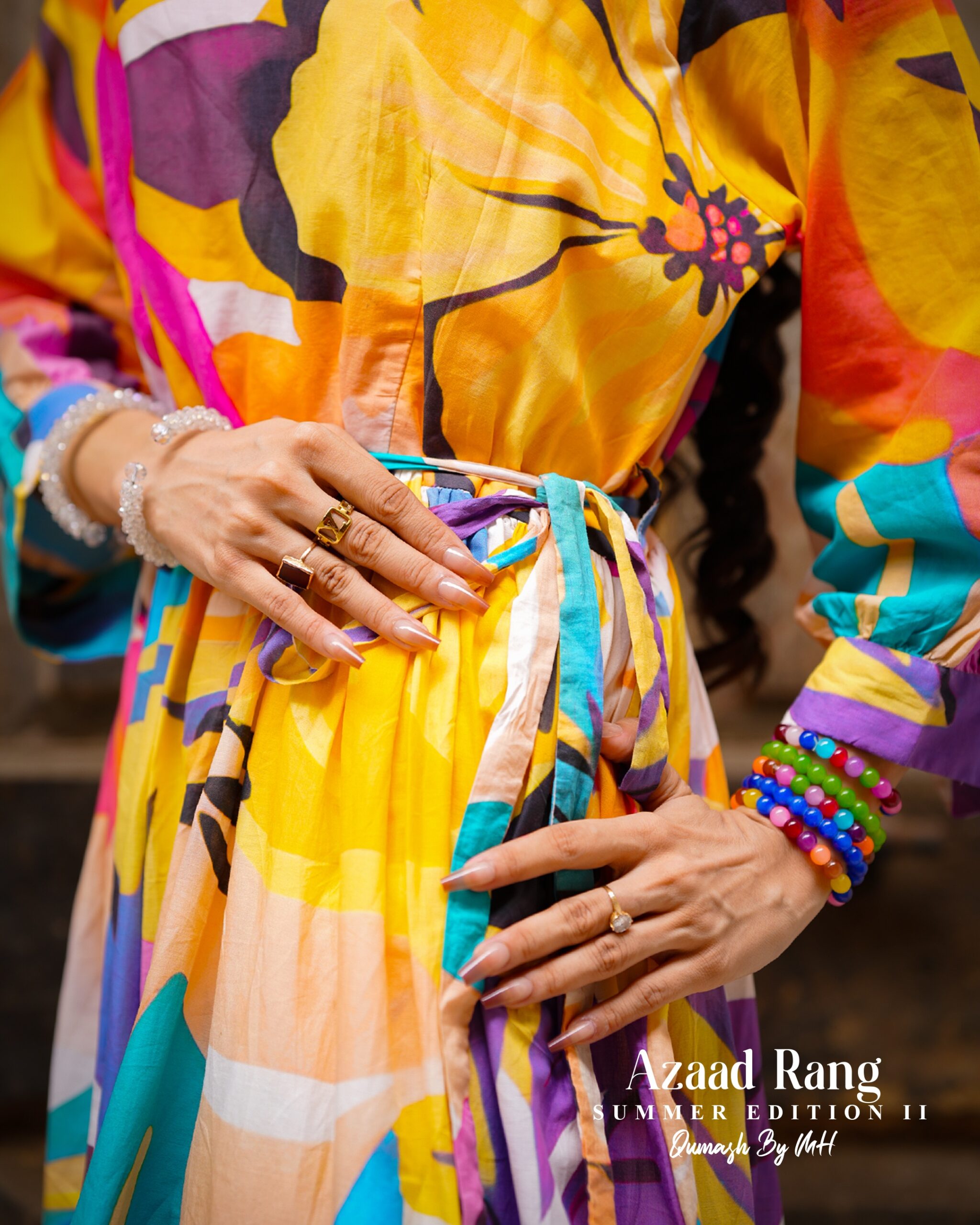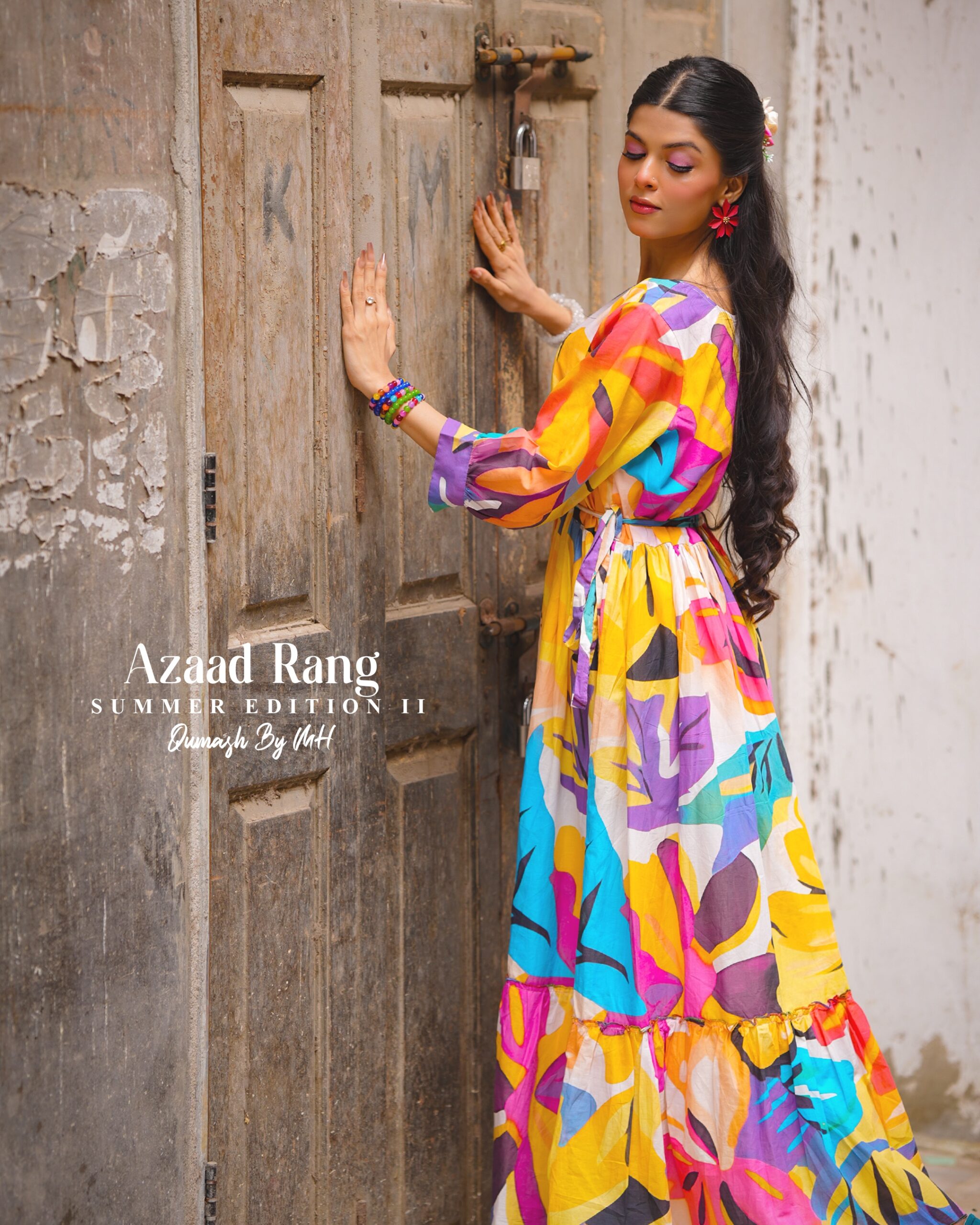 Step into the season of color and confidence with Mehr Ki Lehrein — a bold expression of joy and individuality. This flowy maxi dress captures the spirit of Azaad Rang through its playful mix of yellows, pinks, purples, and blues. Crafted from soft breathable fabric, it combines comfort with contemporary elegance. The cinched waist and flared silhouette make it a perfect statement piece for brunches, resort wear, or festive summer evenings.